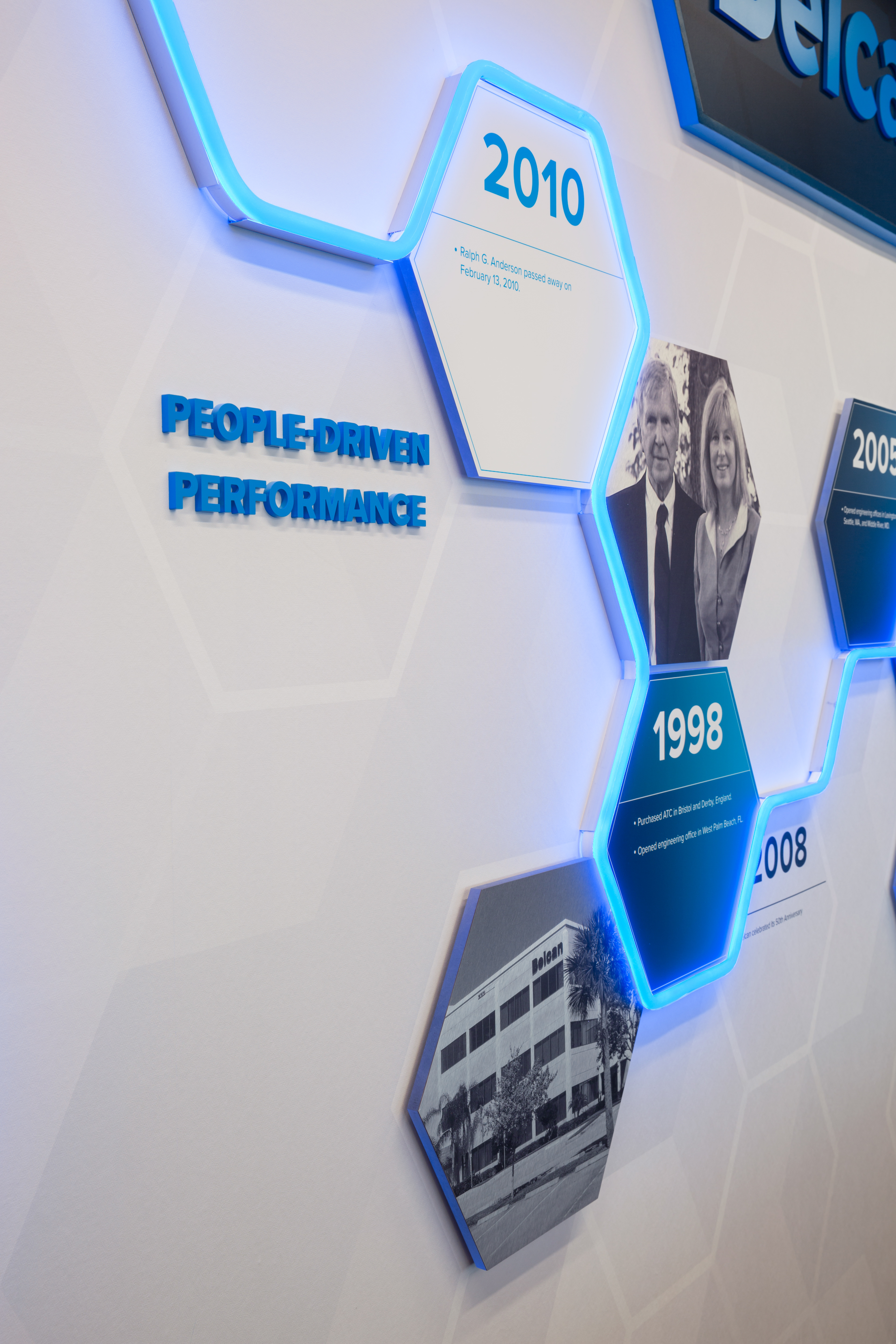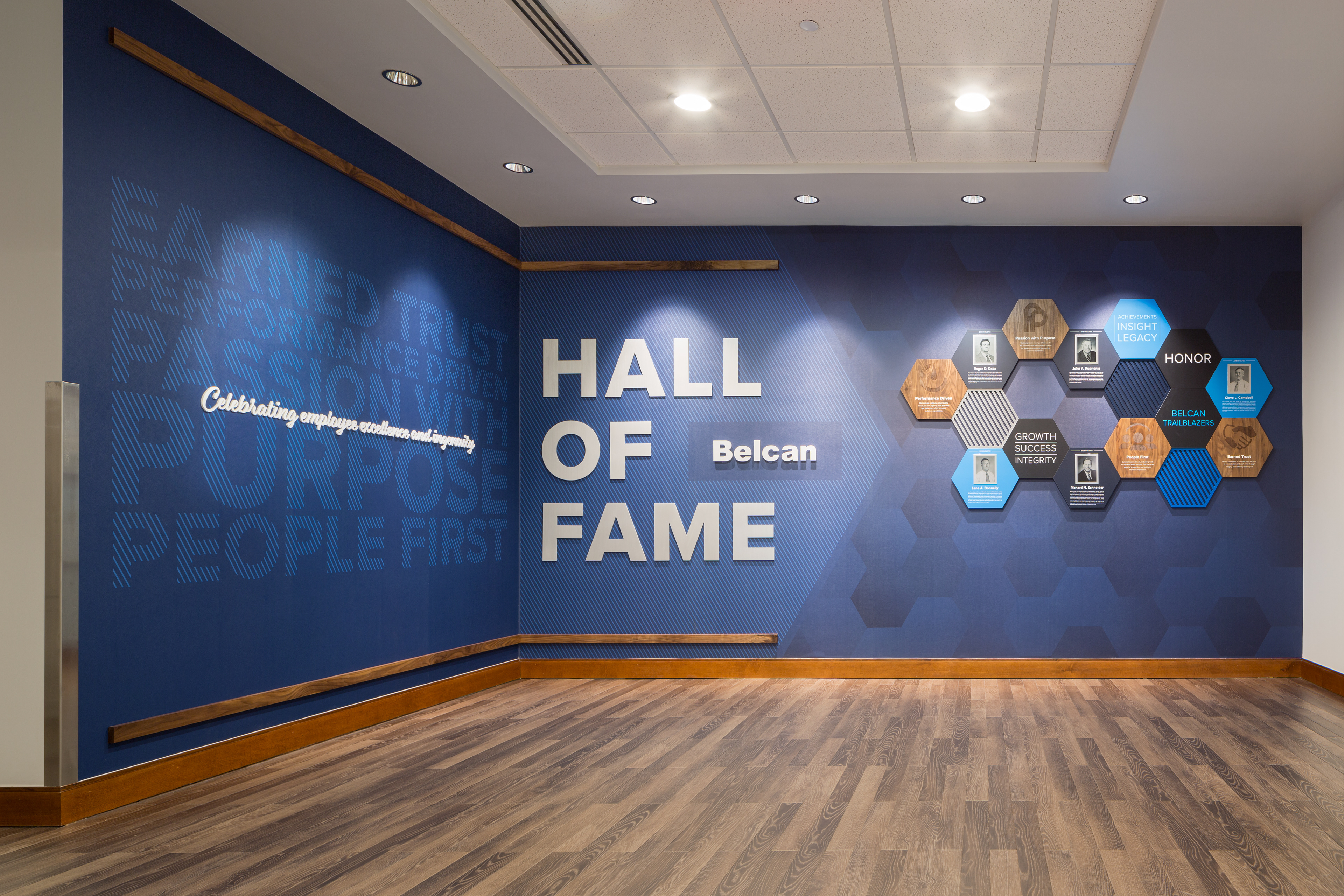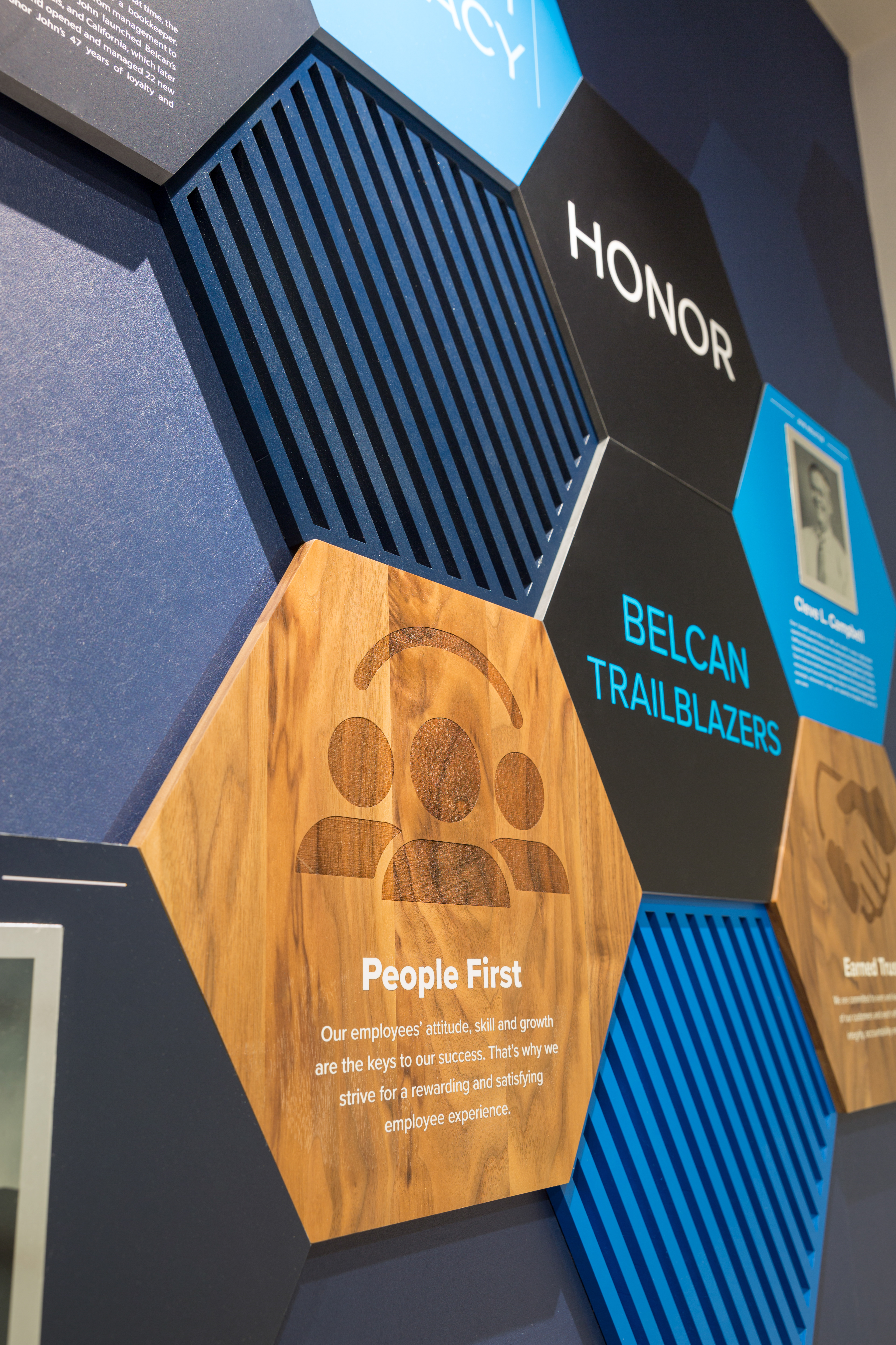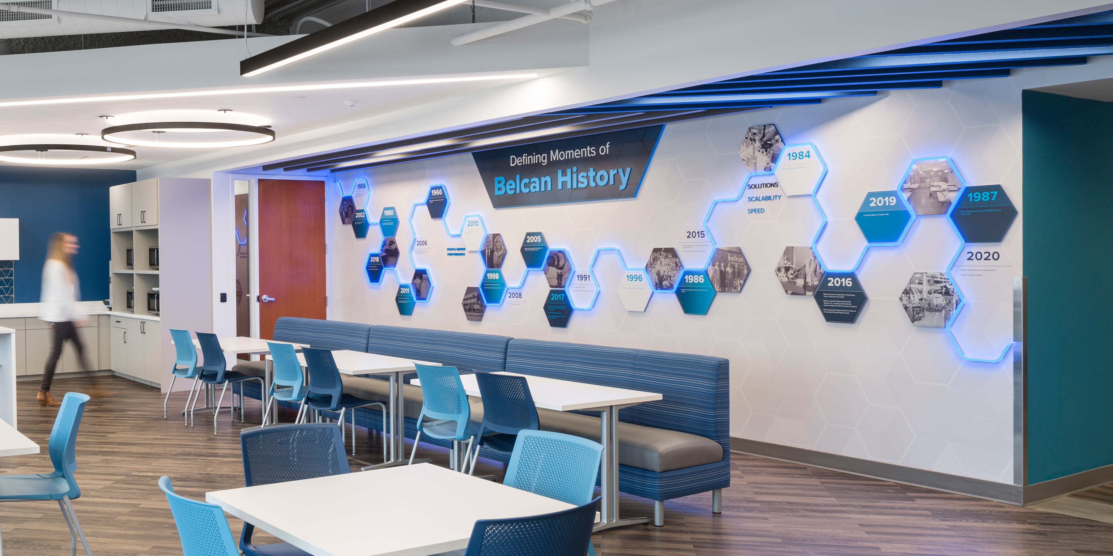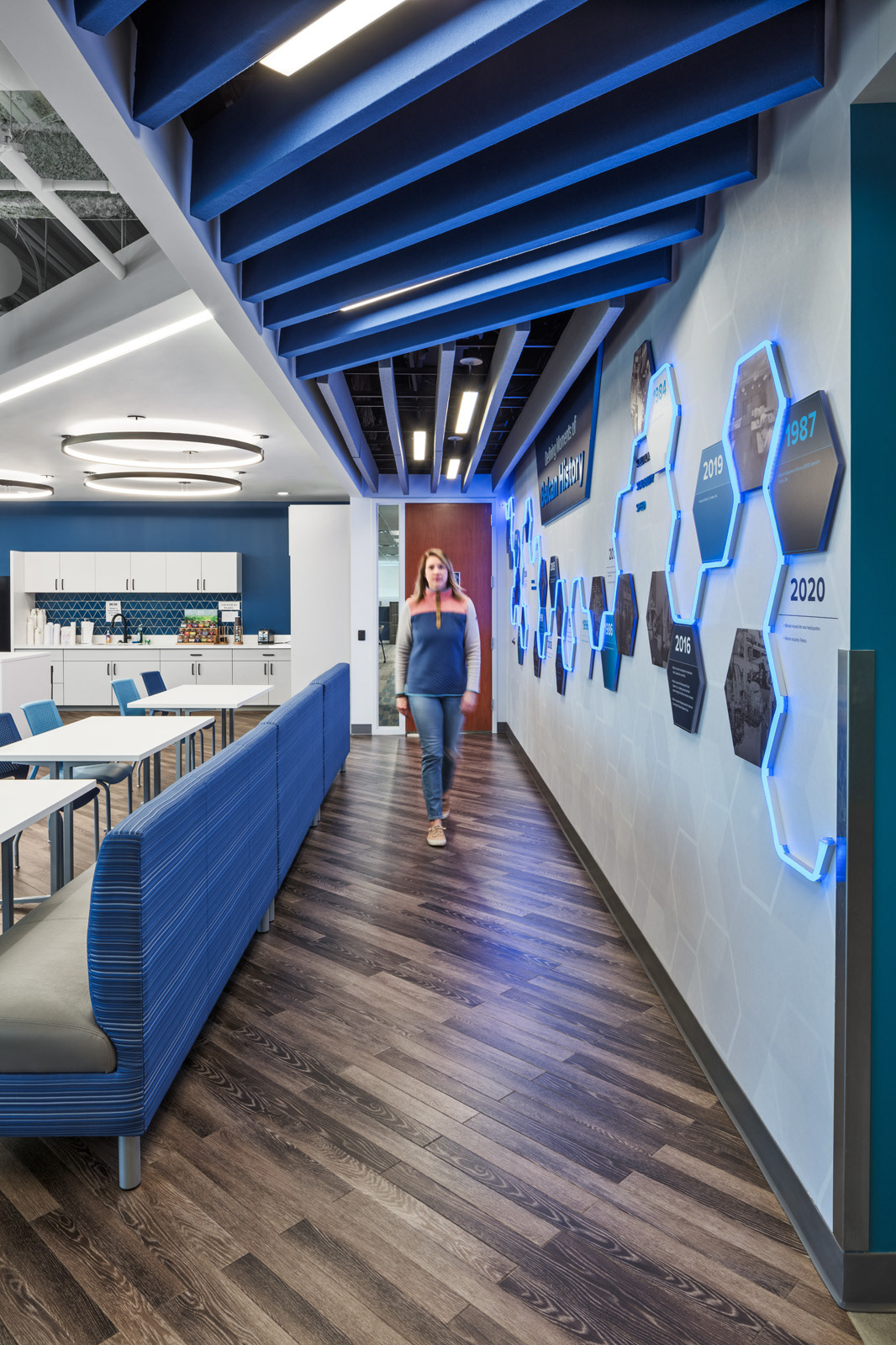 Intended as a cultural hub, the cafe features a dynamic timeline with interchangable milestone plaques hugging LED rope light, an abstracted blue heartbeat of sorts. The striking, non-chronological system allows Belcan to swap out plaques for maximum flexibility and growth. The executive lounge leverages a similar concept to the cafe but incorporates higher end materials to compliment the interior design finishes. Celebrating Belcan's Hall of Fame, a display of routed walnut and laser cut acrylic plaques create a mosaic that can be built upon as new inductees are added.