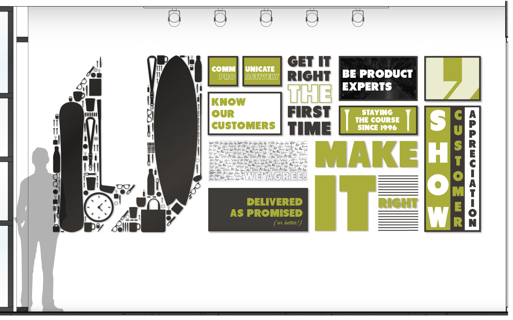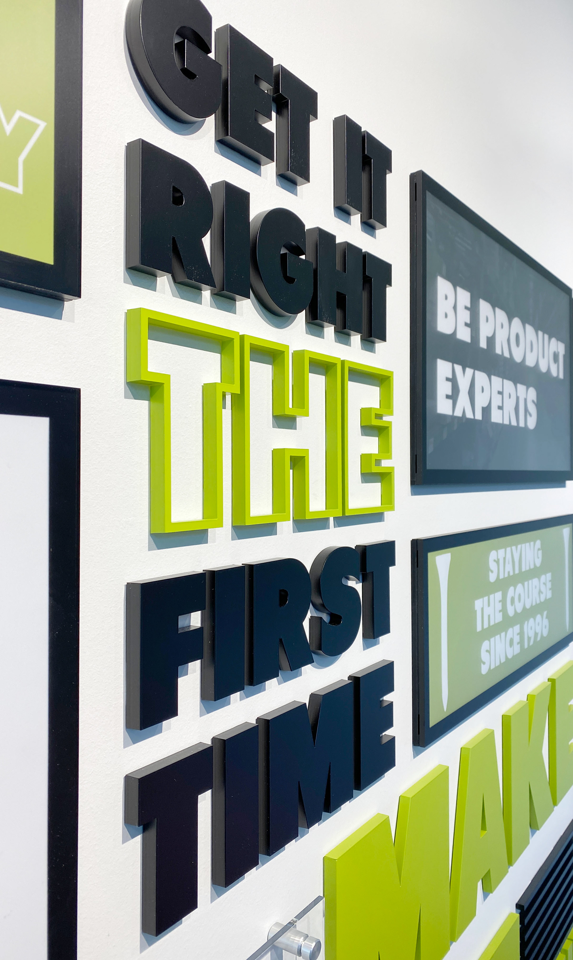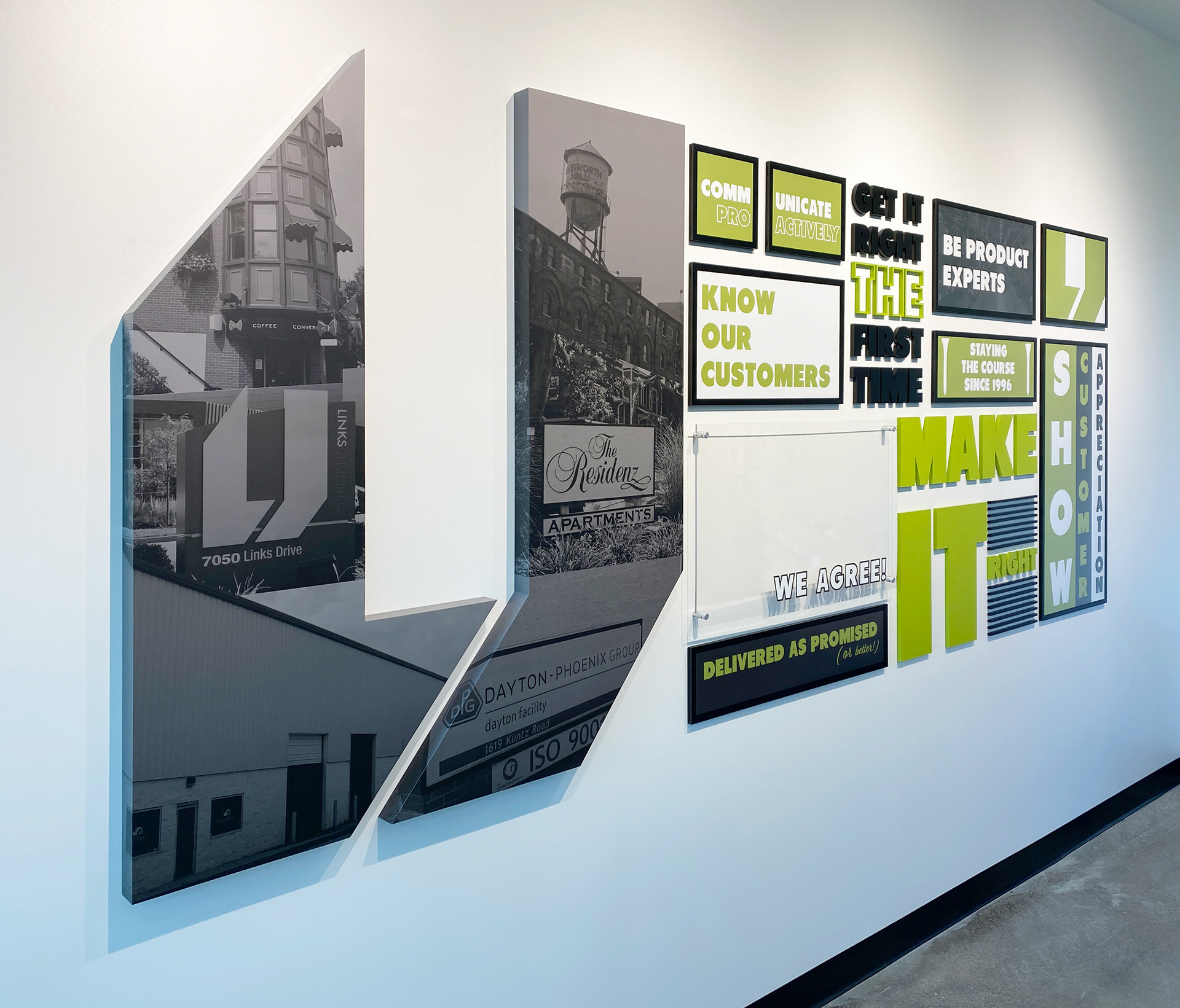 Links Unlimited's Cincinnati headquarters is spacious and bright, meticulously crafted with the intention of attracting and retaining top-tier talent, with a particular focus on Millennials and Gen Z individuals. Playful environmental graphics serve as narrative threads, weaving together the story of Links' evolution from its inception in promotional products to its expansion into fulfillment and procurement services. Among the custom installations are signage ingeniously crafted from golf tees, a reception dimensional collage, and a striking "bravo wall" that ingeniously repurposes chain links to visually commemorate employee tenure and clients' glowing reviews.