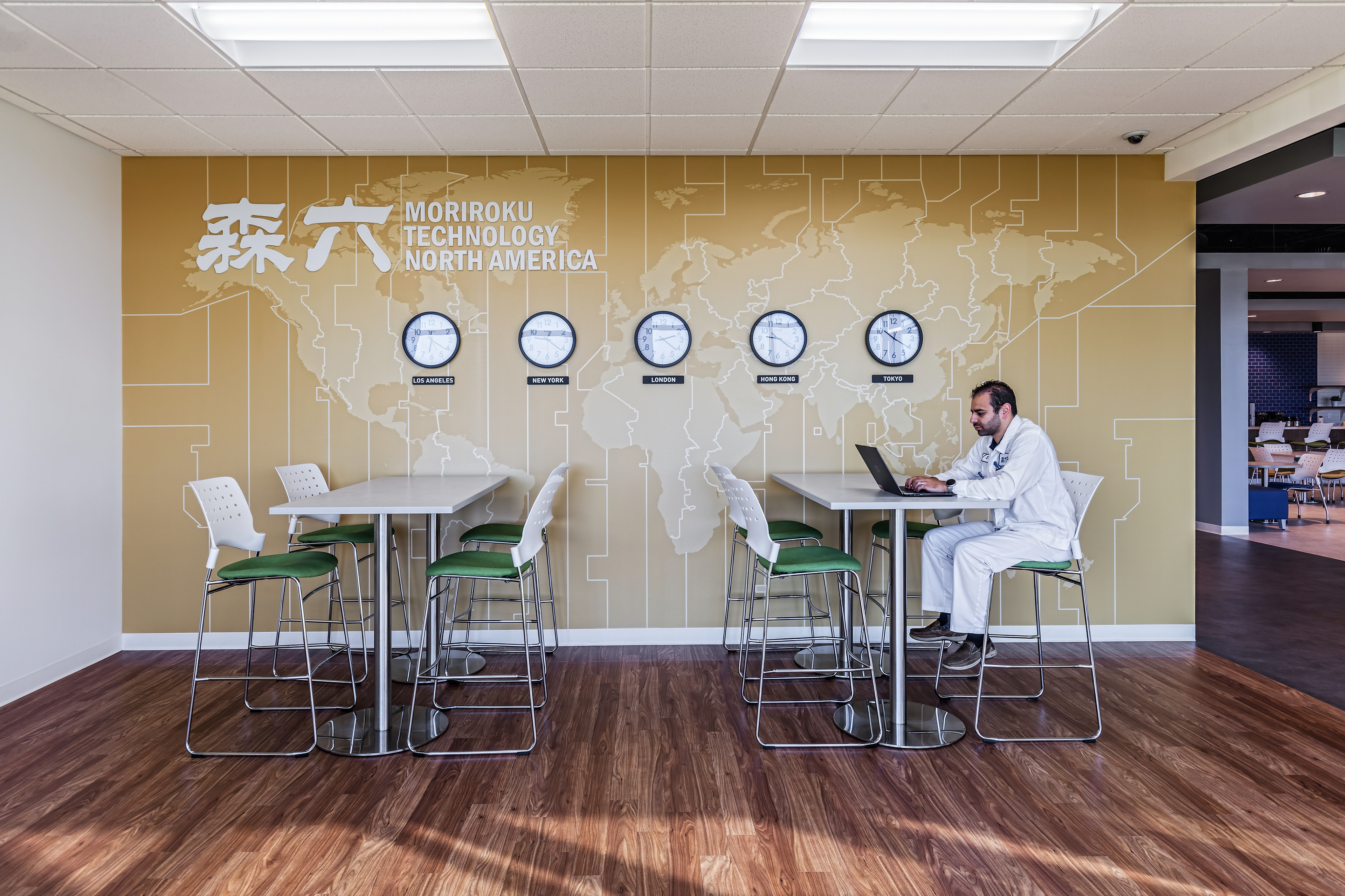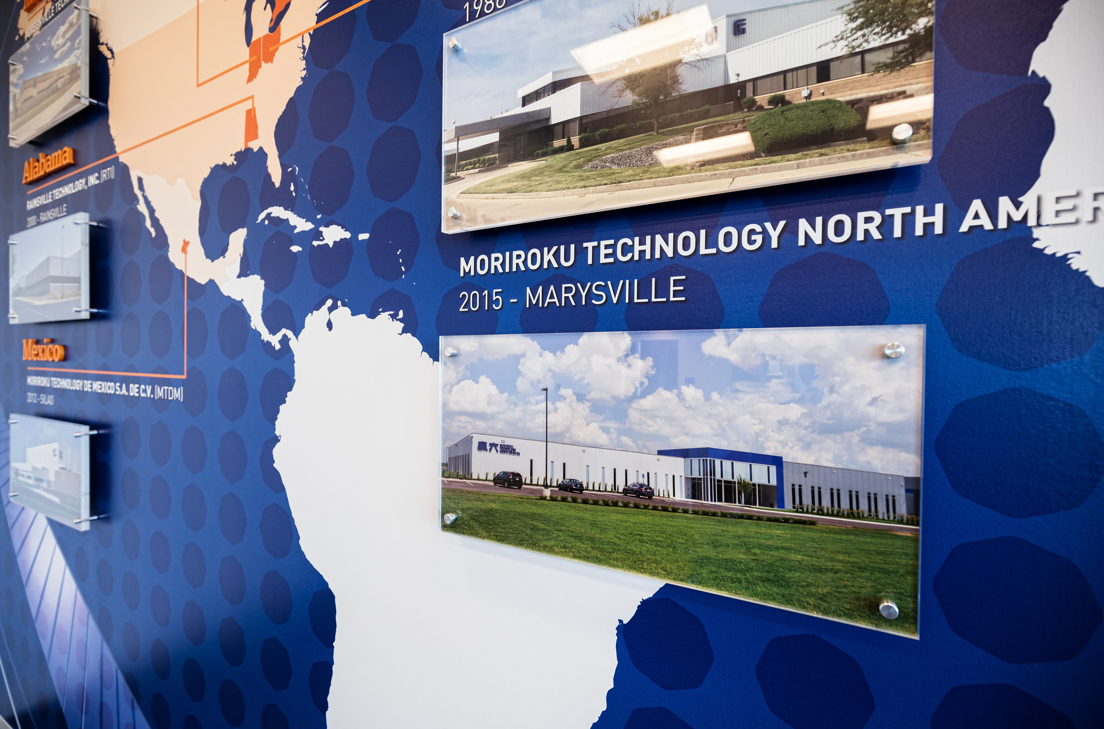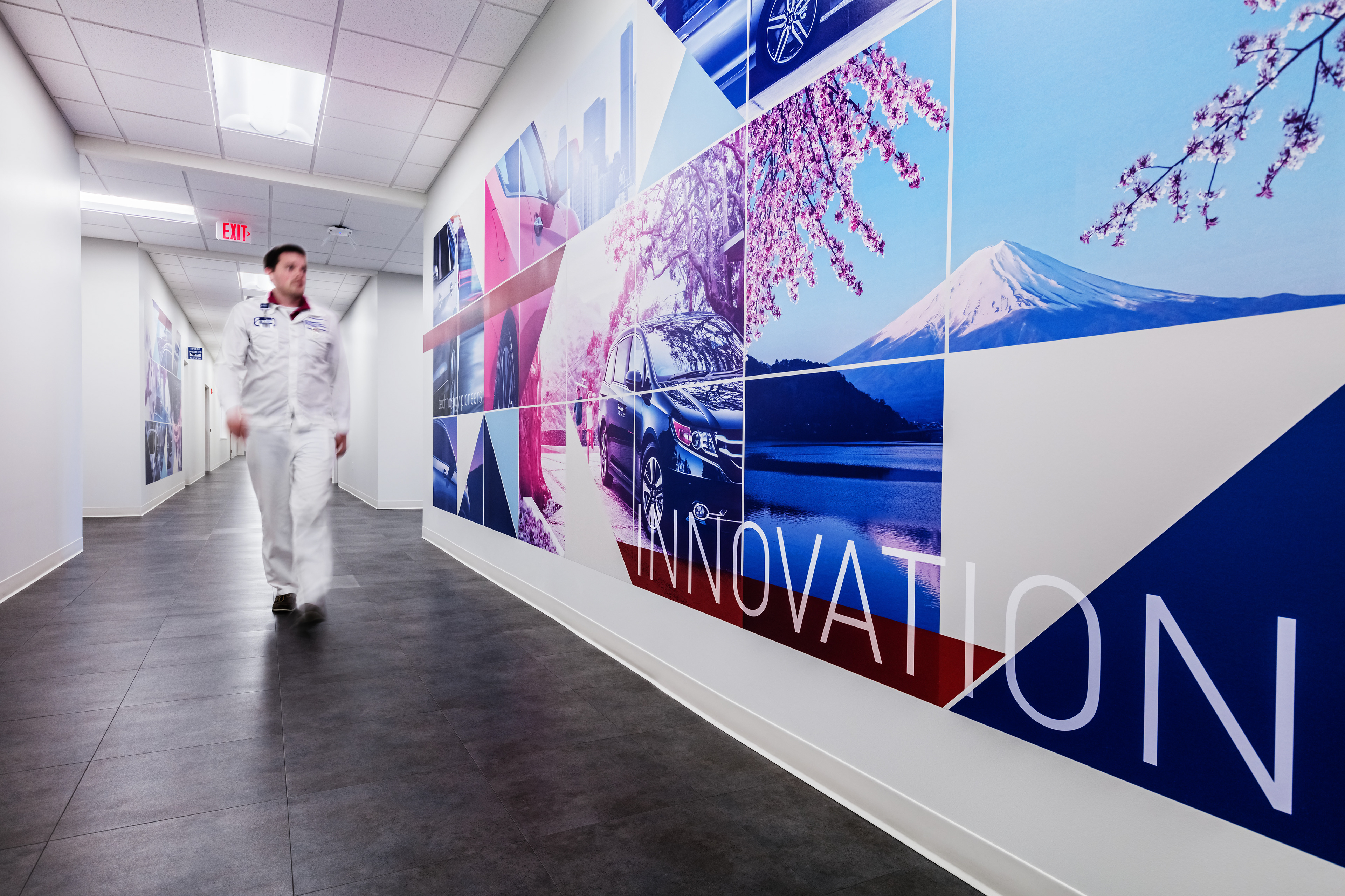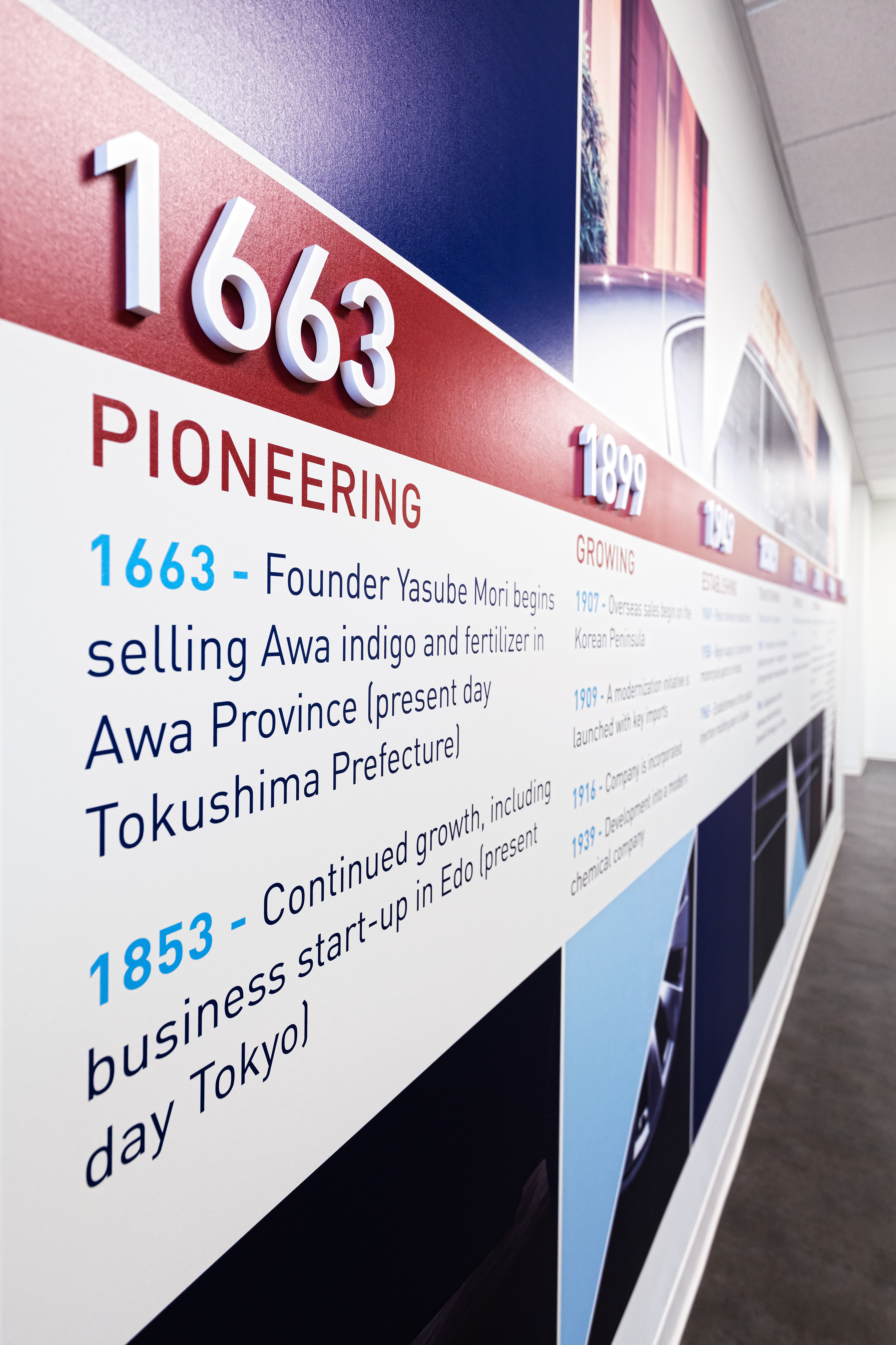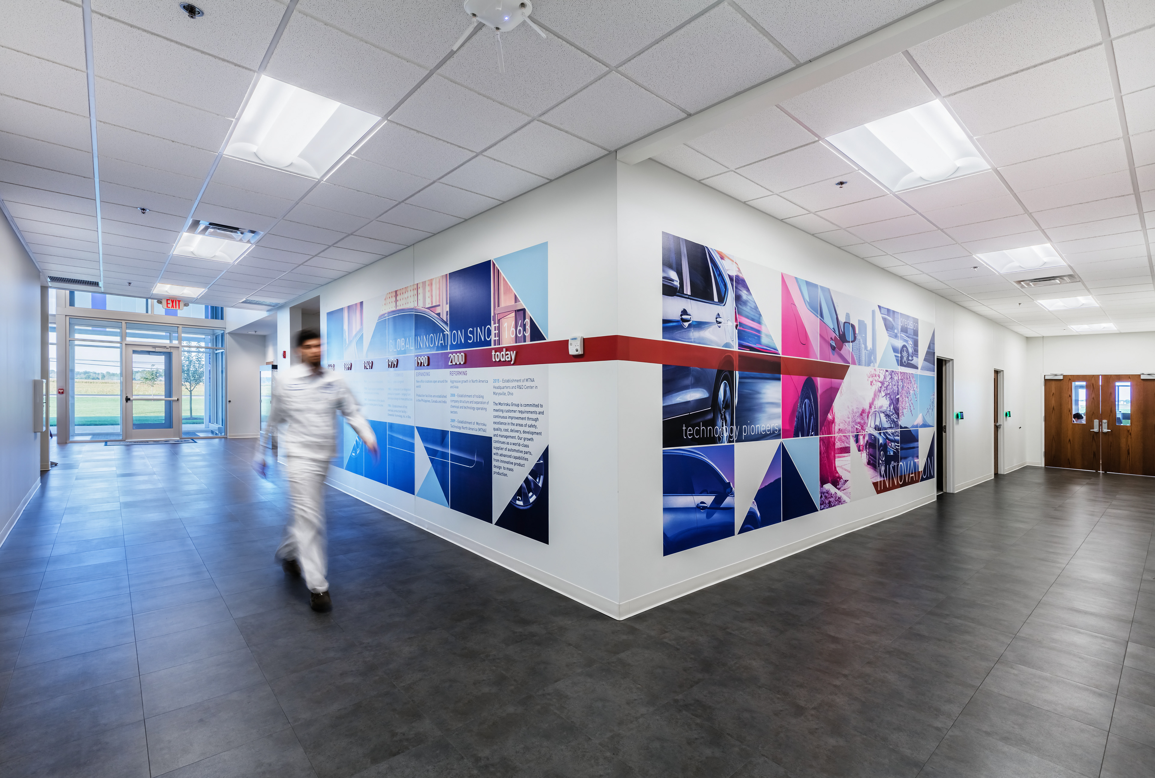 Moriroku's office graphics serve as vibrant tributes to their global influence and unwavering commitment to innovation. Colorful mosaics embellish walls that were once starkly white, proudly showcasing the company's Japanese heritage and remarkable achievements in the automotive design industry. A meticulously crafted timeline chronicles the journey of Moriroku, detailing major milestones that have shaped the company's identity and success. Meanwhile, interior walls adorned with color blocks serve as dynamic canvases, highlighting core values and key brand phrases that encapsulate Moriroku's ethos and vision.